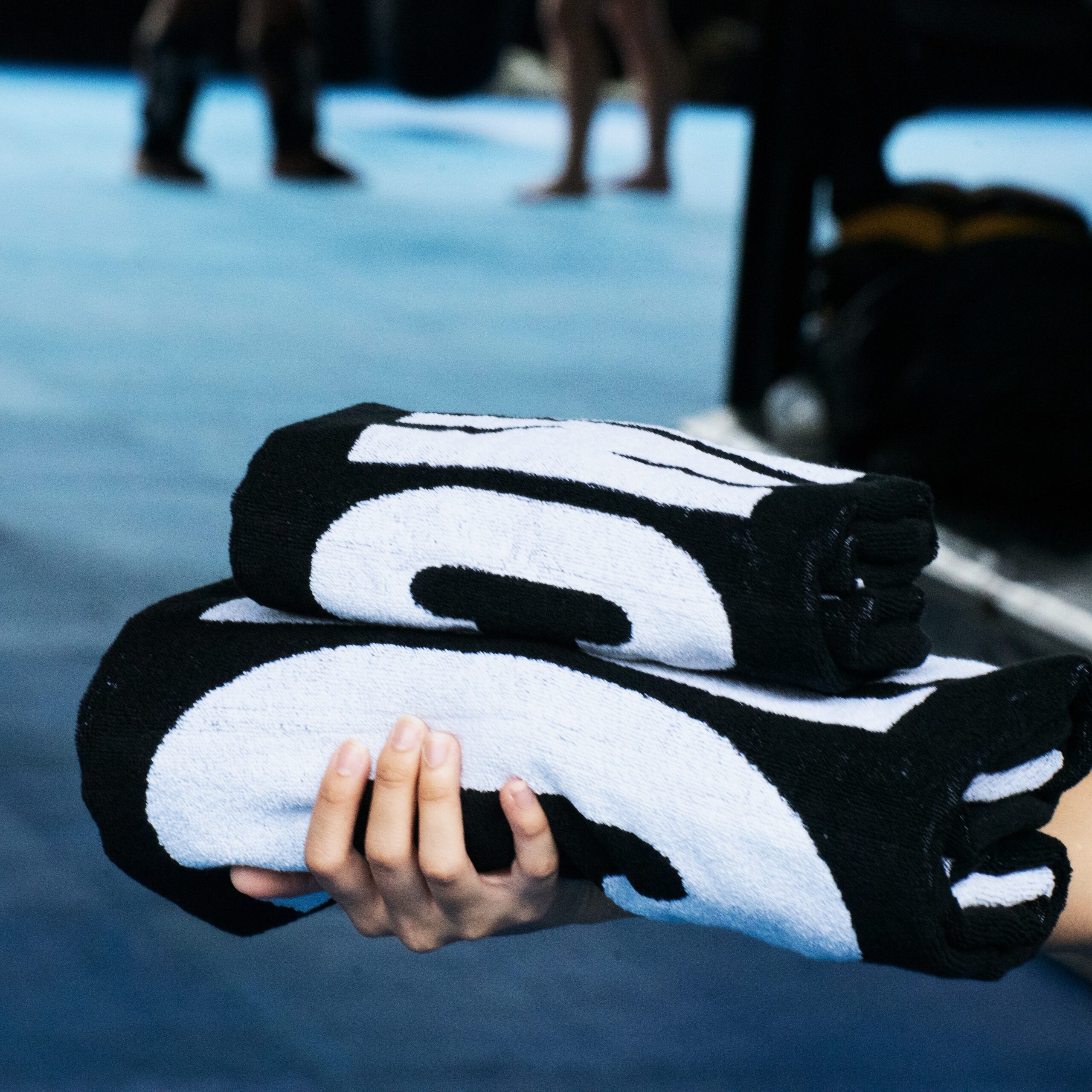 Punch It Jacquard Towels with woven logo. Available in hand & bath sizes, perfect for home, gym, or travel.