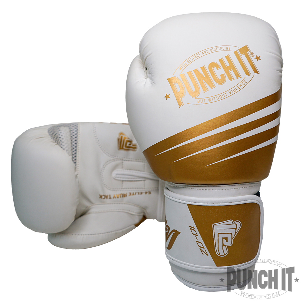 Punch it Boxing Gloves S4-Elite Muay Tack in a white-gold matt PU look.